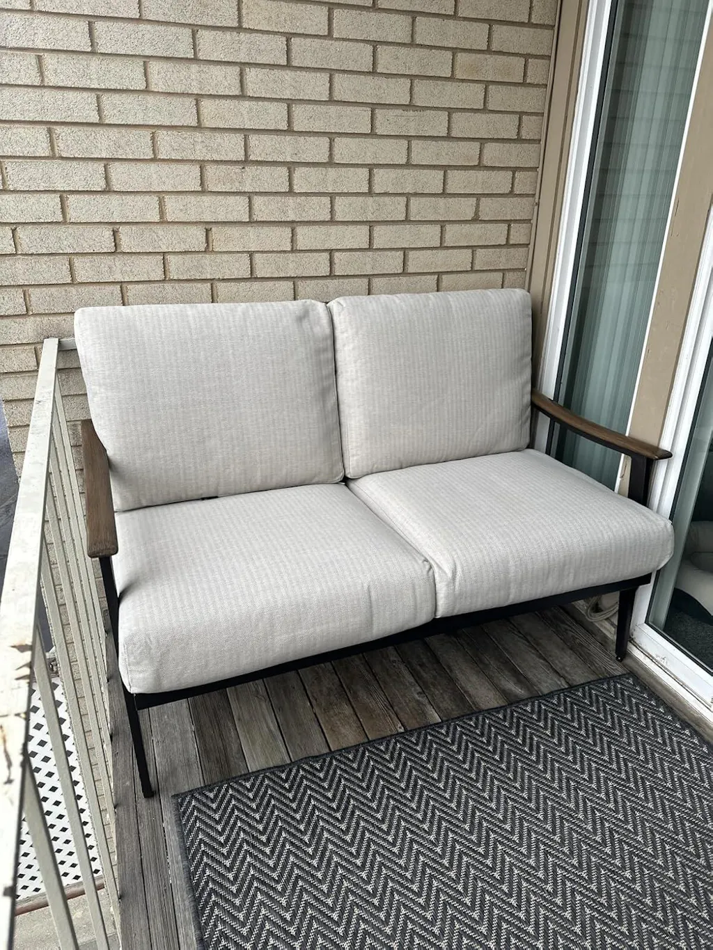 Este sofá de dos plazas para exteriores cuenta con un marco de acero resistente, suaves cojines de 6" de grosor con fundas de tela de olefina extraíbles y un elegante respaldo de mimbre con reposabrazos con textura de madera. Ideal para la comodidad y la durabilidad en cualquier clima.